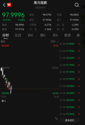 今日(4月16日),截至北京时间9:30,美元指数报97.9996。
