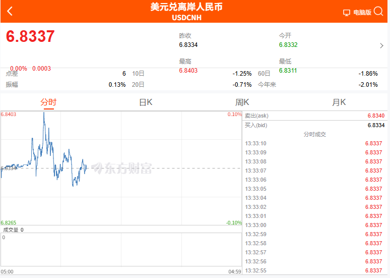 连日来,人民币升值趋势仍在继续,反映人民币短期交易波动的离岸人民币汇率大涨:4月8日离岸人民币对美元汇率日内大涨超300点,最高升至6.8216,创2023年3月以来新高。此外,在岸人民币盘中一度升破6.83关口,亦刷新同期高点。截至4月9日13时,离岸与在岸人民币对美元汇率均稳定运行在6.83附近,呈现“内外共振、双向收敛”的阶段性特征。